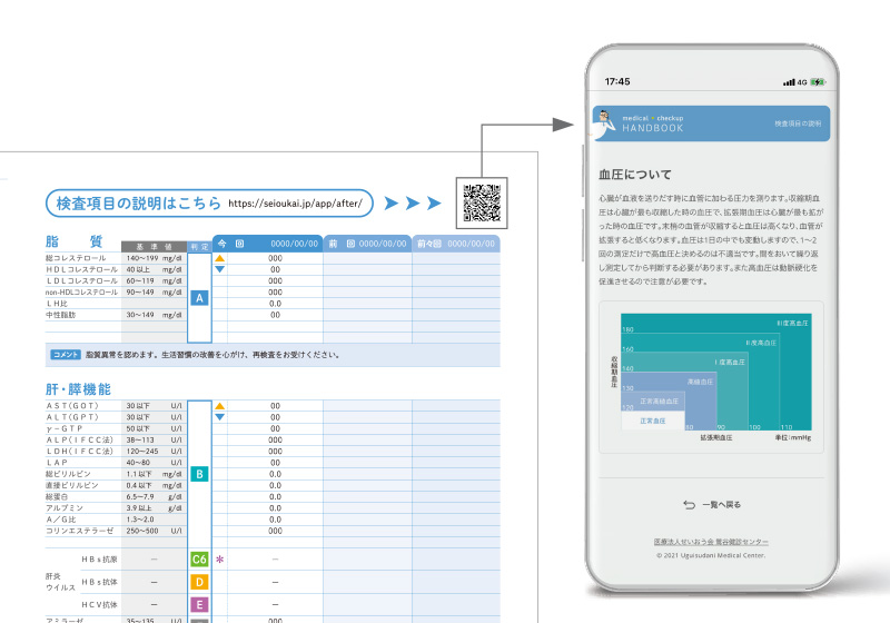 健診後約3週間で過去の履歴を併記した報告書をご指定先にお届けします。各検査結果に記載されたQRコードからスマホ等で詳しい説明をご覧いただけます。