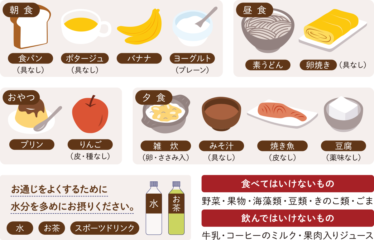 以下の食事例を参考に繊維質の少ない食事をお摂りください。