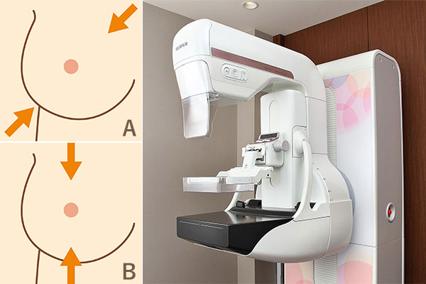 乳がんや、しこりとして触れないごく早期の乳がんも発見できます。プラスチック板で乳房を片ずつはさみ、平らに圧迫した状態で撮影をします。対象①の方は斜め方向撮影(A)のみ、②の方は上下方向(B)も行います。