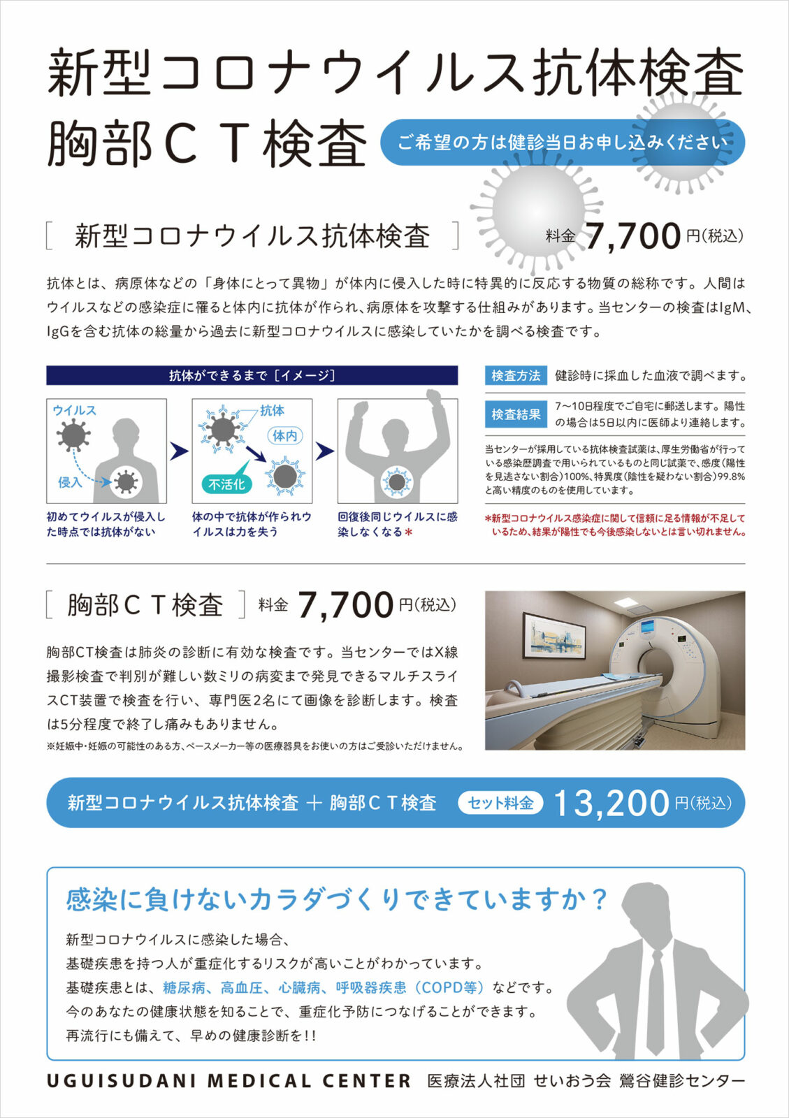 当センターでは、人間ドック、健康診断のオプション検査として、新型コロナウイルス抗体検査を開始しました。この機会にぜひご利用ください。